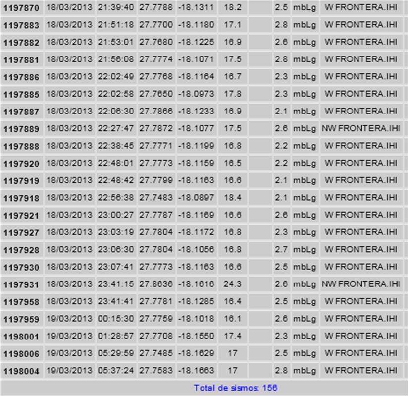 Die Bebenauflistung der vergangenen Stunden. Es bleibt jetzt heute genau zu beobachten wie sich die Situation weiter entwickelt. Auch wäre es wünschenswert, daß die 2. Eruptionsstelle vom Juni/Juli 2012 an der Westspitze der Insel genau beobachtet wird. Genau hier liegt im Moment das Epizentrum. Eine erhöhte Gasemission dürfte jetzt noch nicht messbar sein, dafür liegen die Beben noch zu tief. Es bleibt also weiter spannend.